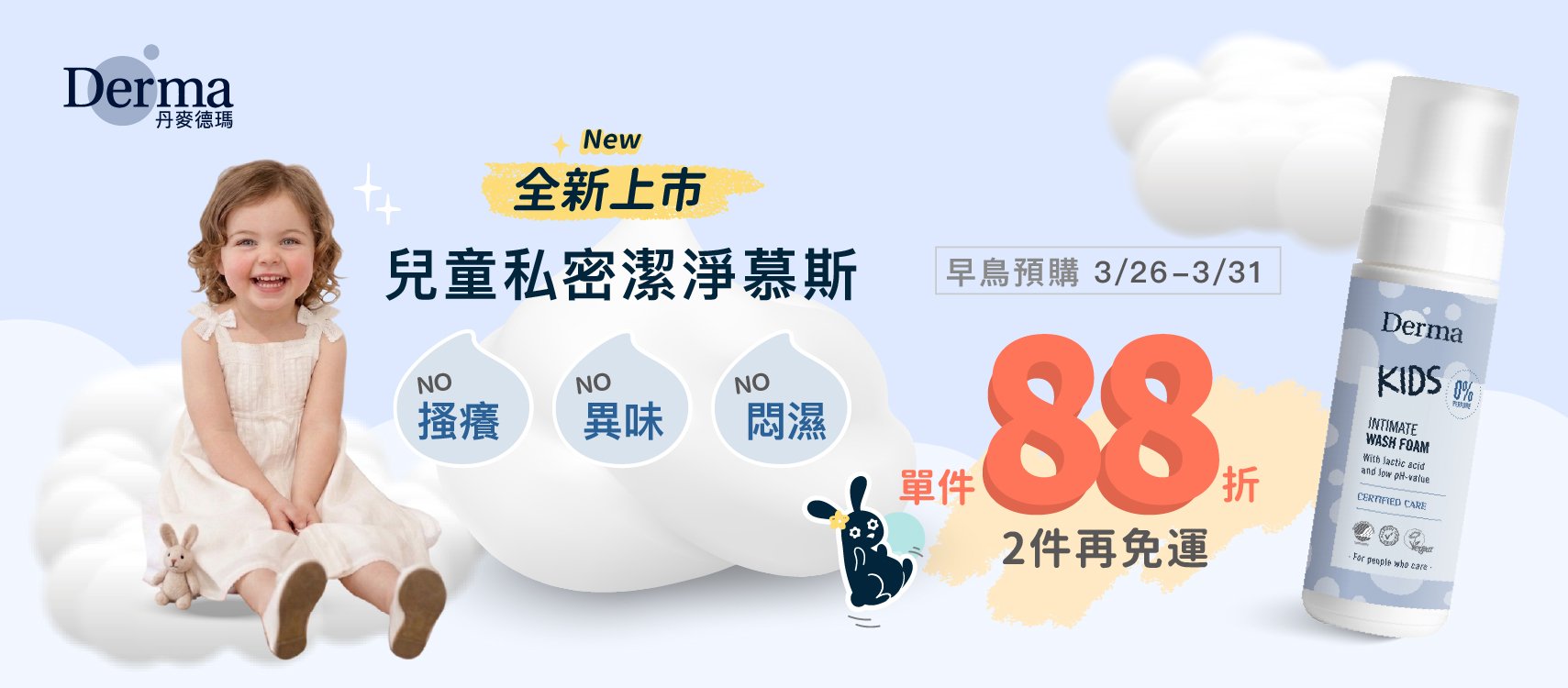 3/26-3/31Derma兒童私密慕斯早鳥預購,單件88折,2件再免運