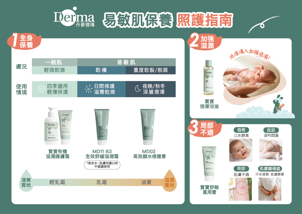 Derma寶寶全系列產品源自天然溫和、無香且不添加已知過敏原,自新生兒起即適用,也適合易敏性肌膚寶寶。